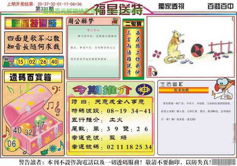 | 331期:绝杀5码【07.31.38.43.44】开:龙26中 |